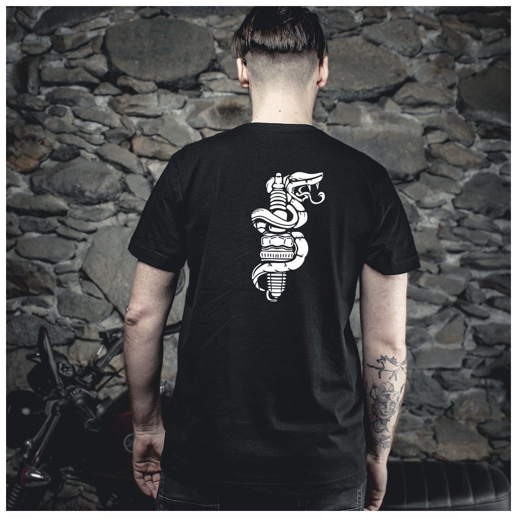 Jiskra, co zažehne tvůj motor. Motiv „Spark“ jsem v mojí dílně navrhl jako poctu srdci každýho stroje. Zapalovací svíčku v sevření hada na zádech jsem vlastnoručně nakreslil, aby symbolizovala energii a sílu, která se probouzí s každým nastartováním. Je to kousek pro chlapy, co vědí, že i ta nejmenší součástka rozhoduje o tom, jaká bude tvoje jízda.